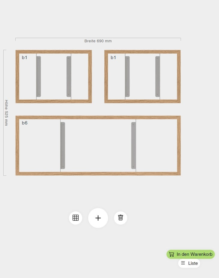 Der Konfigurator hilft dir, deine Regalwand selbst zu gestalten. Wir haben schon mal ein paar Kompositionen vorbereitet, als Basis für deine Ideen. Oder du fängst mit einer ganz leeren Wand an: Mit dem '+'-Button fügst du neue Regale hinzu. Löschen kannst du sie im Papierkorb. Wir schlagen einen Abstand von 50mm vor, dann haben nämlich zwei schmale Regale die selbe Breite wie ein ganz breites Regal – aber auch hier bist du völlig frei. Klicke einfach auf den Raster-Button, dann bestimmst du die Abstände. Los geht’s!