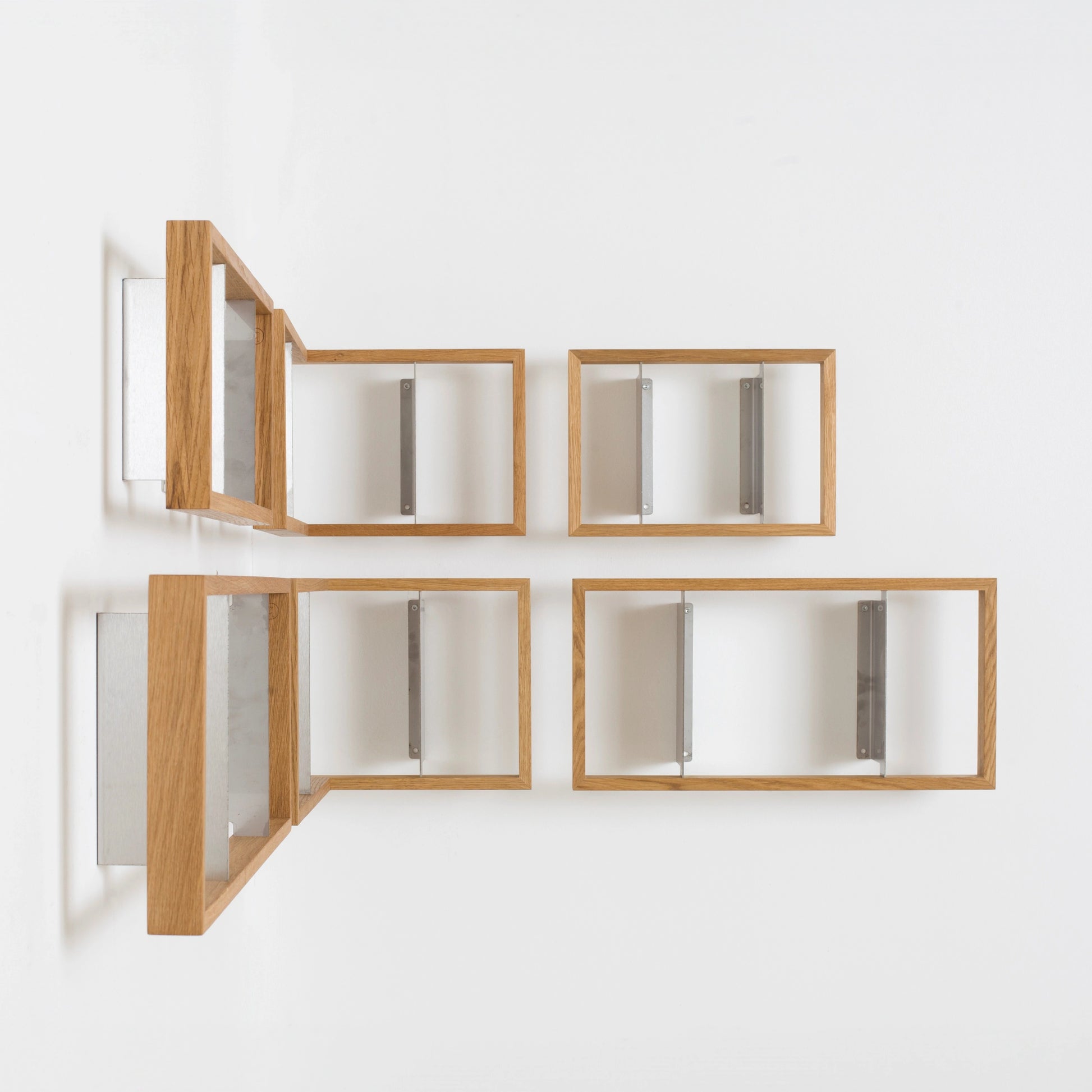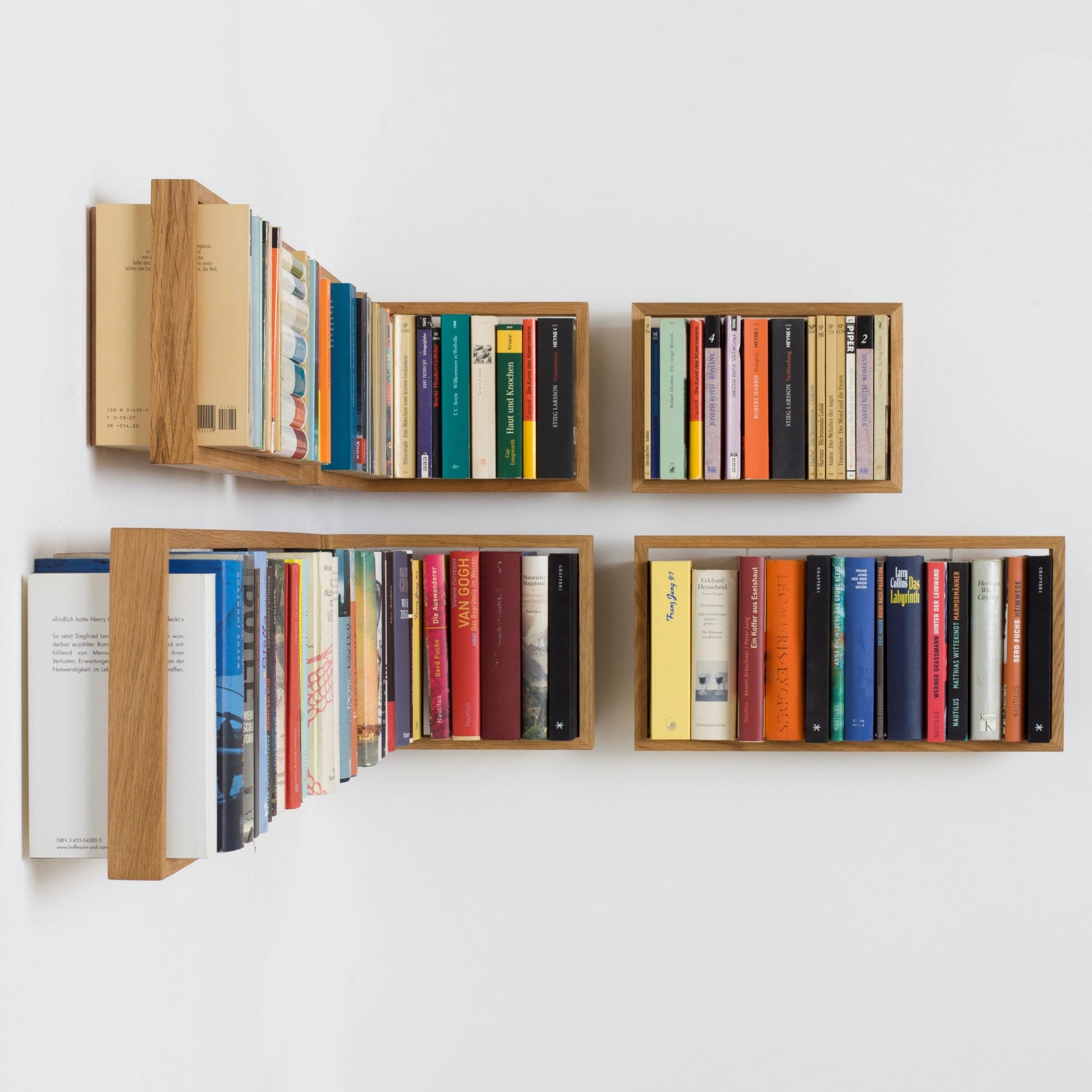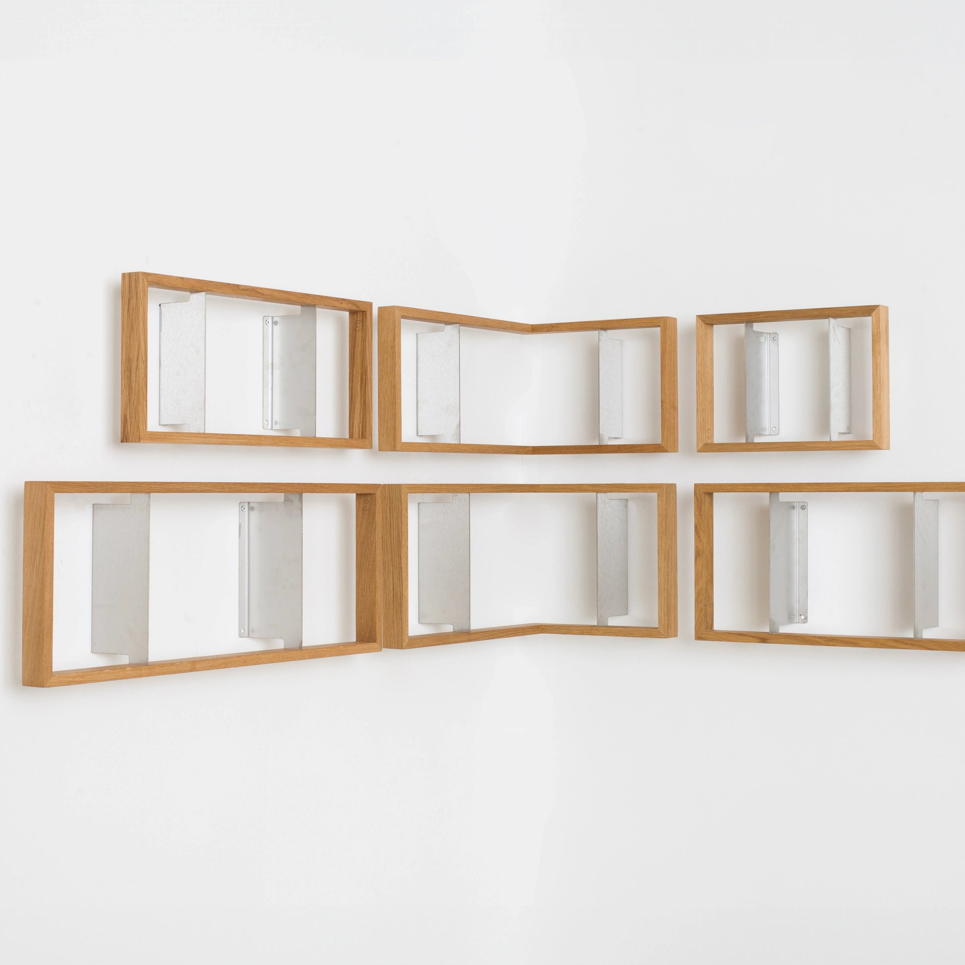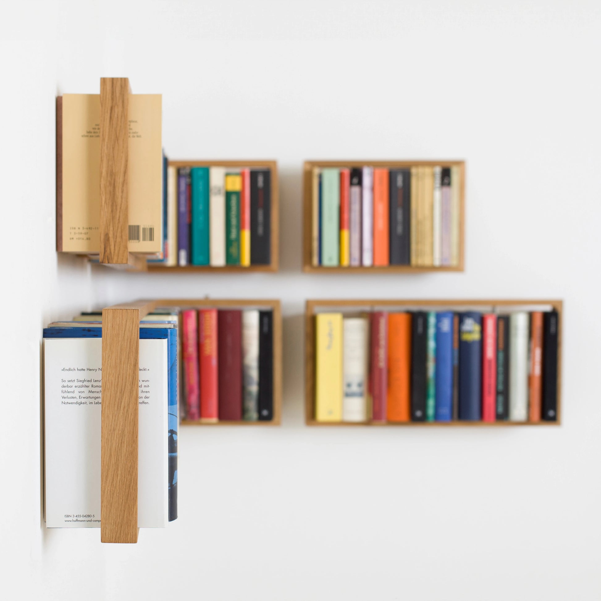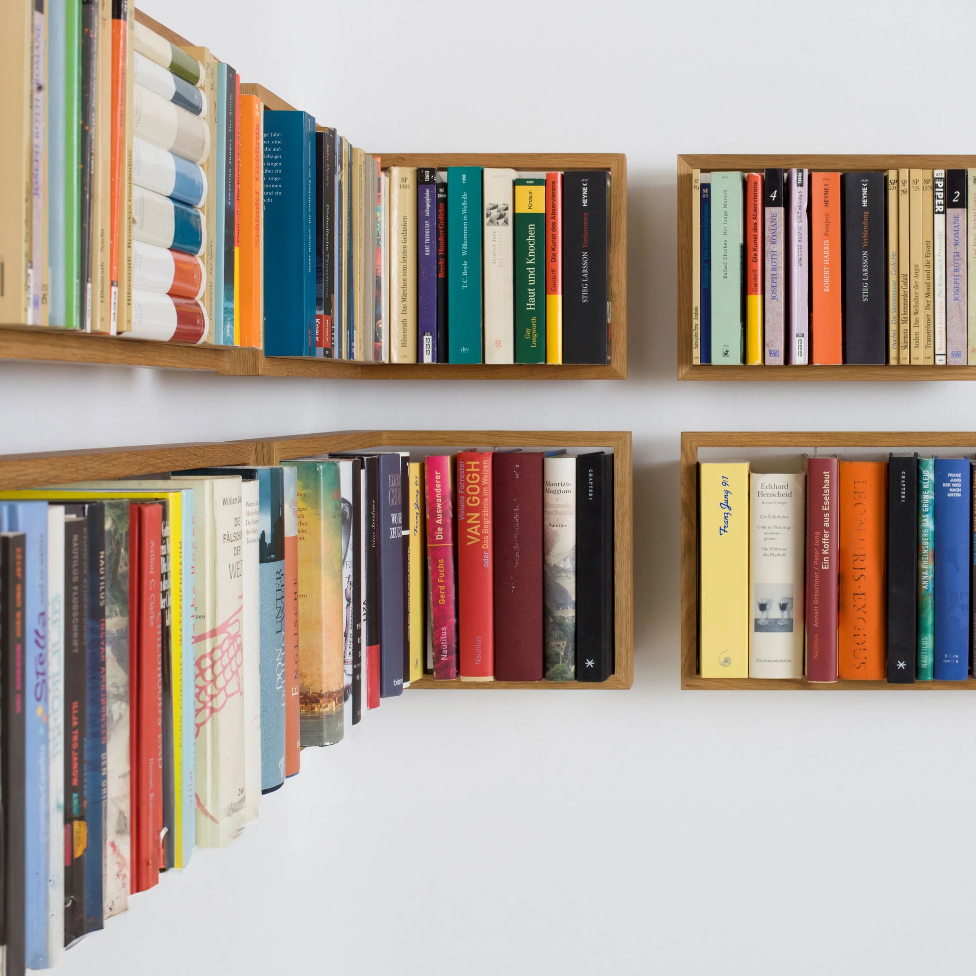 Reolvæggen består af fire reoler fra b-serien og to reoler fra b-eck-serien. Det specielle: bøgerne ser ud til at svæve - kun holdt af træramme lavet af massiv eg. Tager man bøgerne fra reolen, afsløres hemmeligheden. Forsænkede beslag i rustfrit stål holder konstruktionen på væggen.