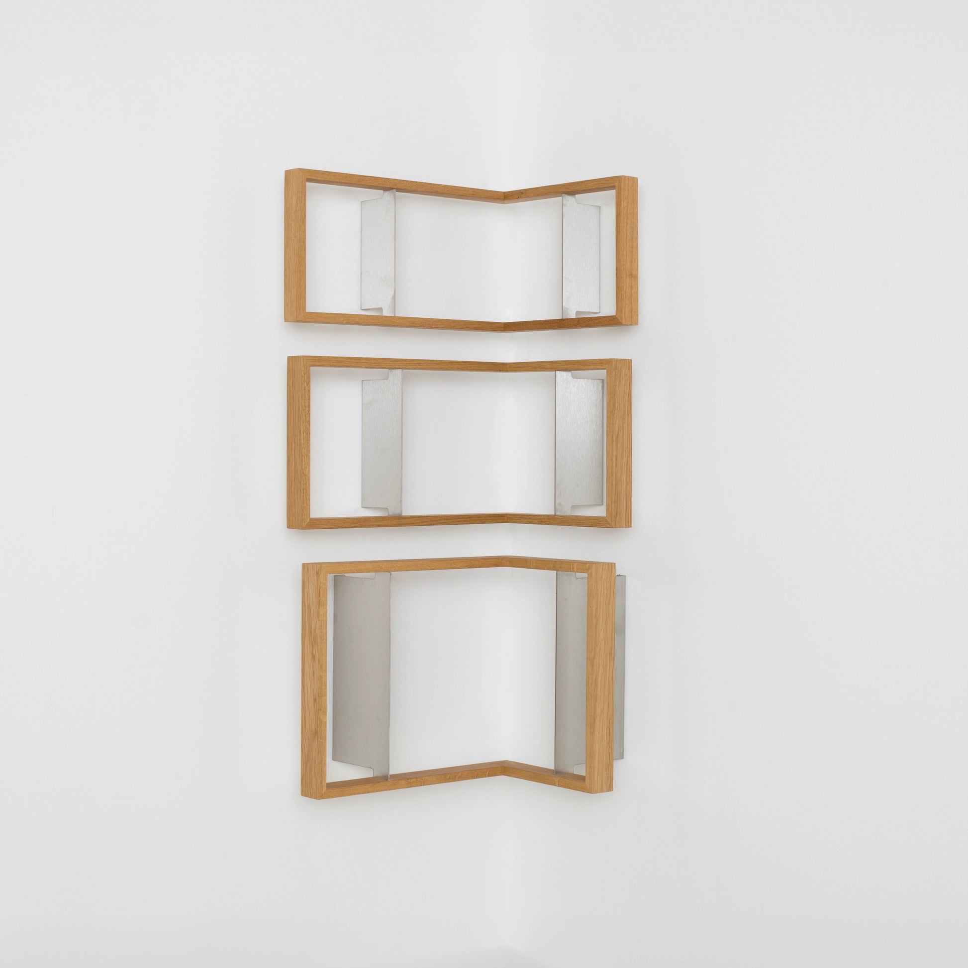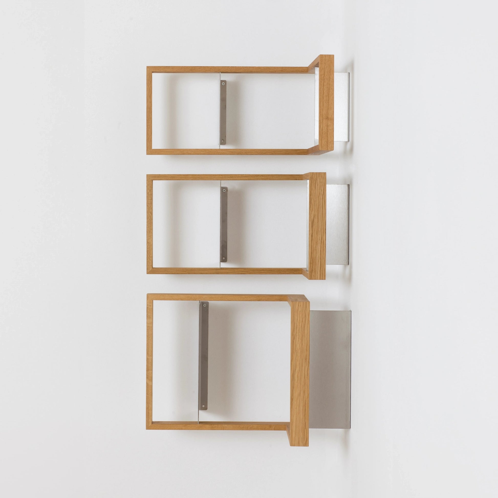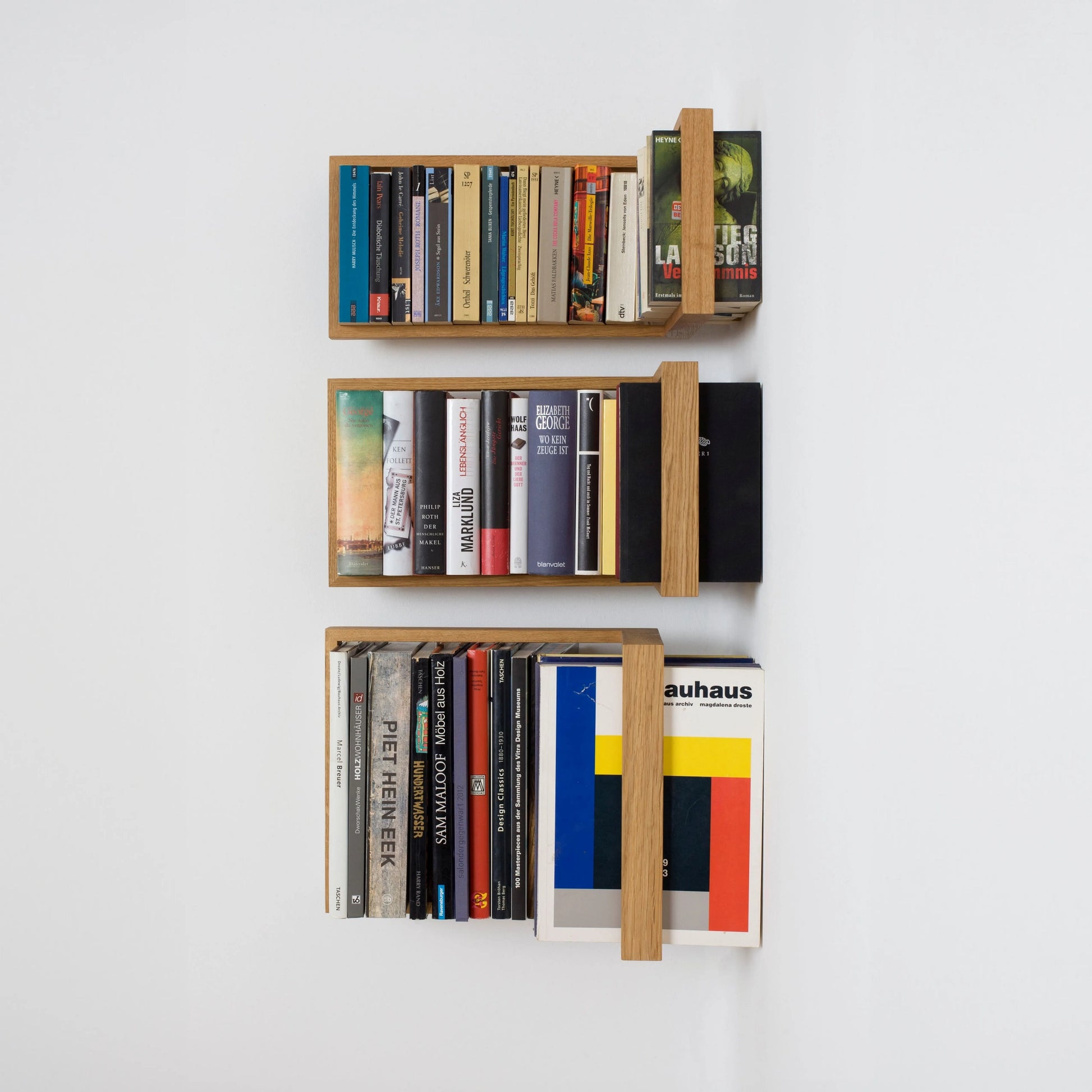 Reolvæggen består af tre hylder fra b-eck serien. Det specielle: bøgerne ser ud til at svæve - kun holdt af træramme lavet af massiv eg. Tager man bøgerne ned fra reolen, afsløres hemmeligheden. Forsænkede beslag i rustfrit stål holder konstruktionen på væggen.
