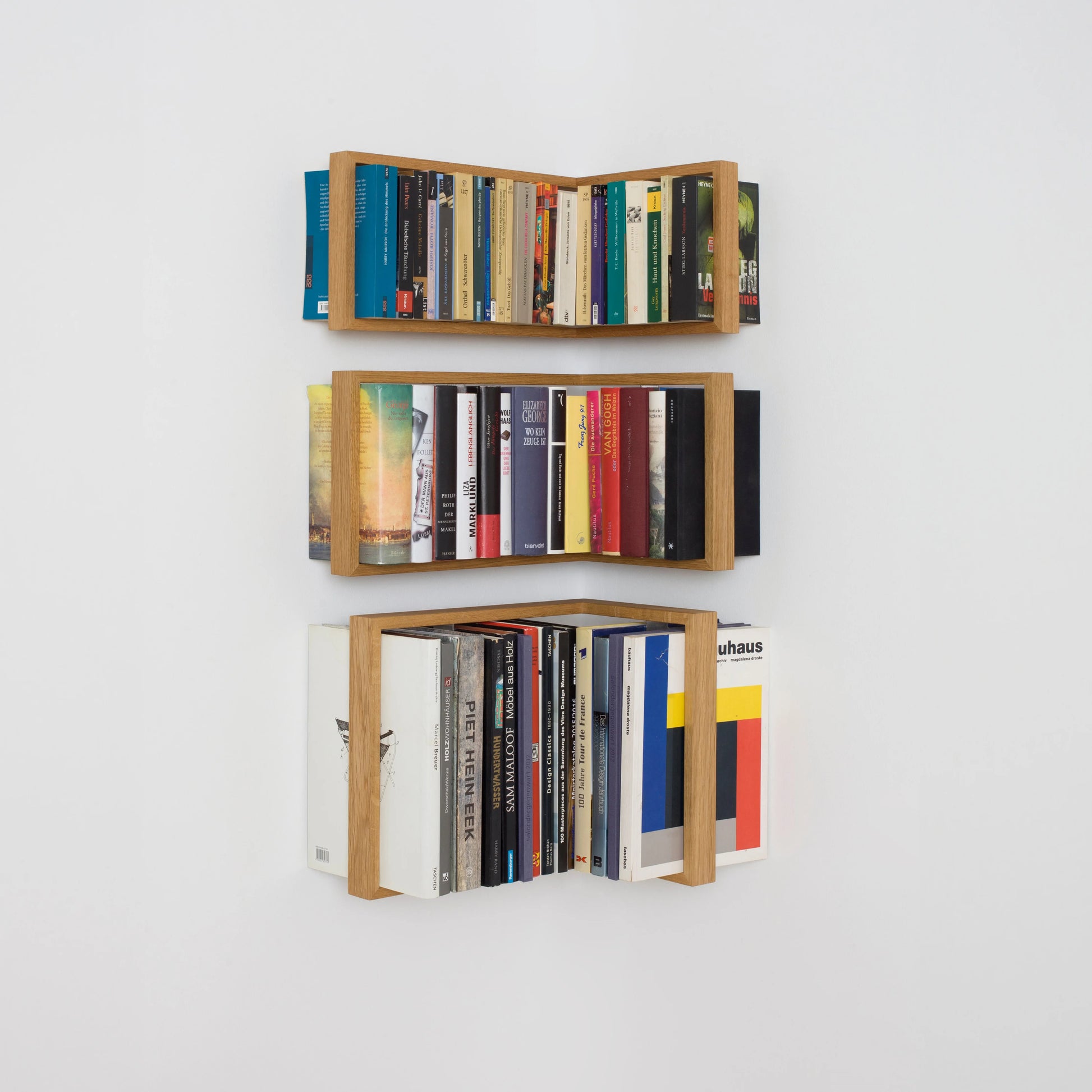 Denne komposition udnytter den ofte ubrugte plads i hjørnet af rummet og rummer effektivt paperbacks, hardcovers og illustrerede bøger.
