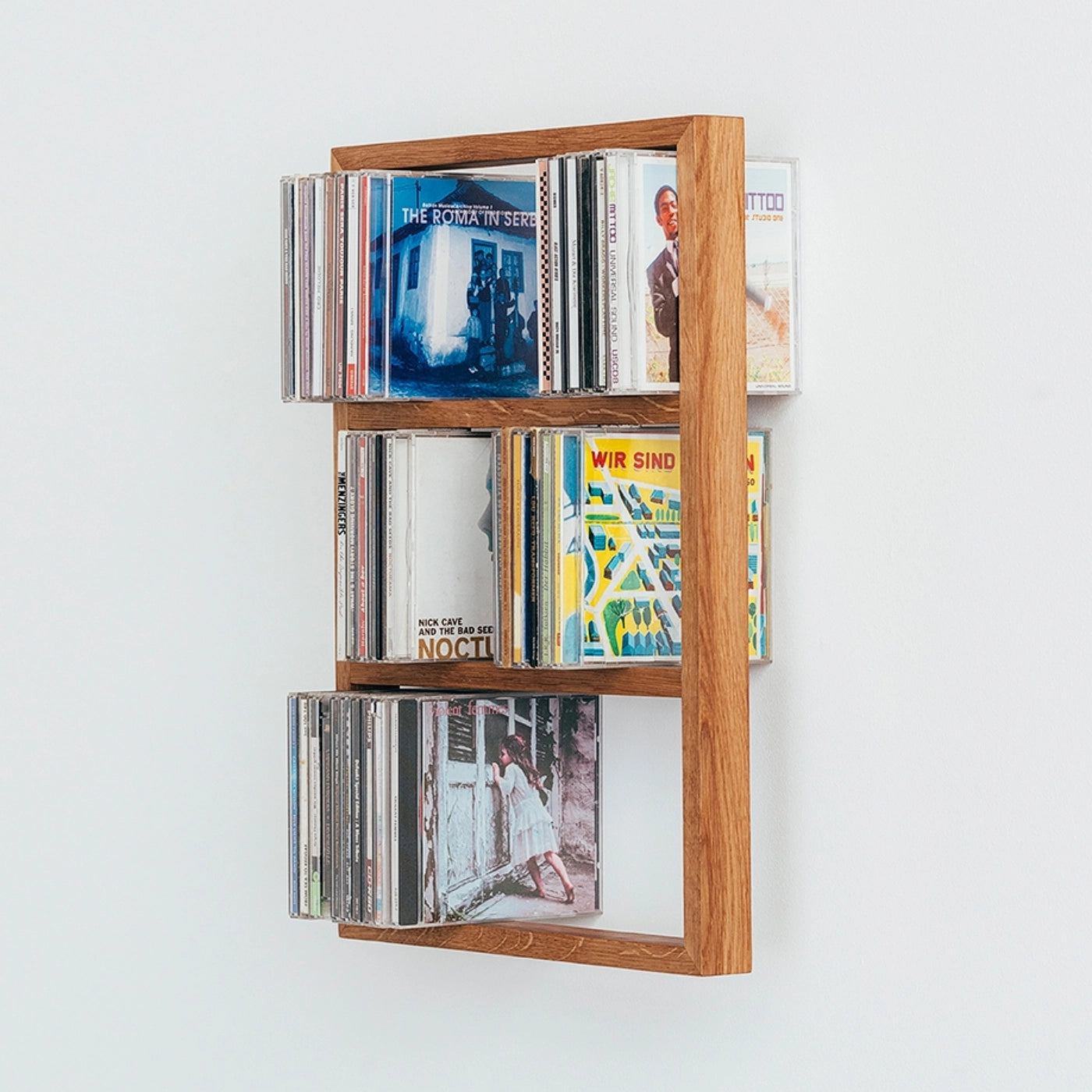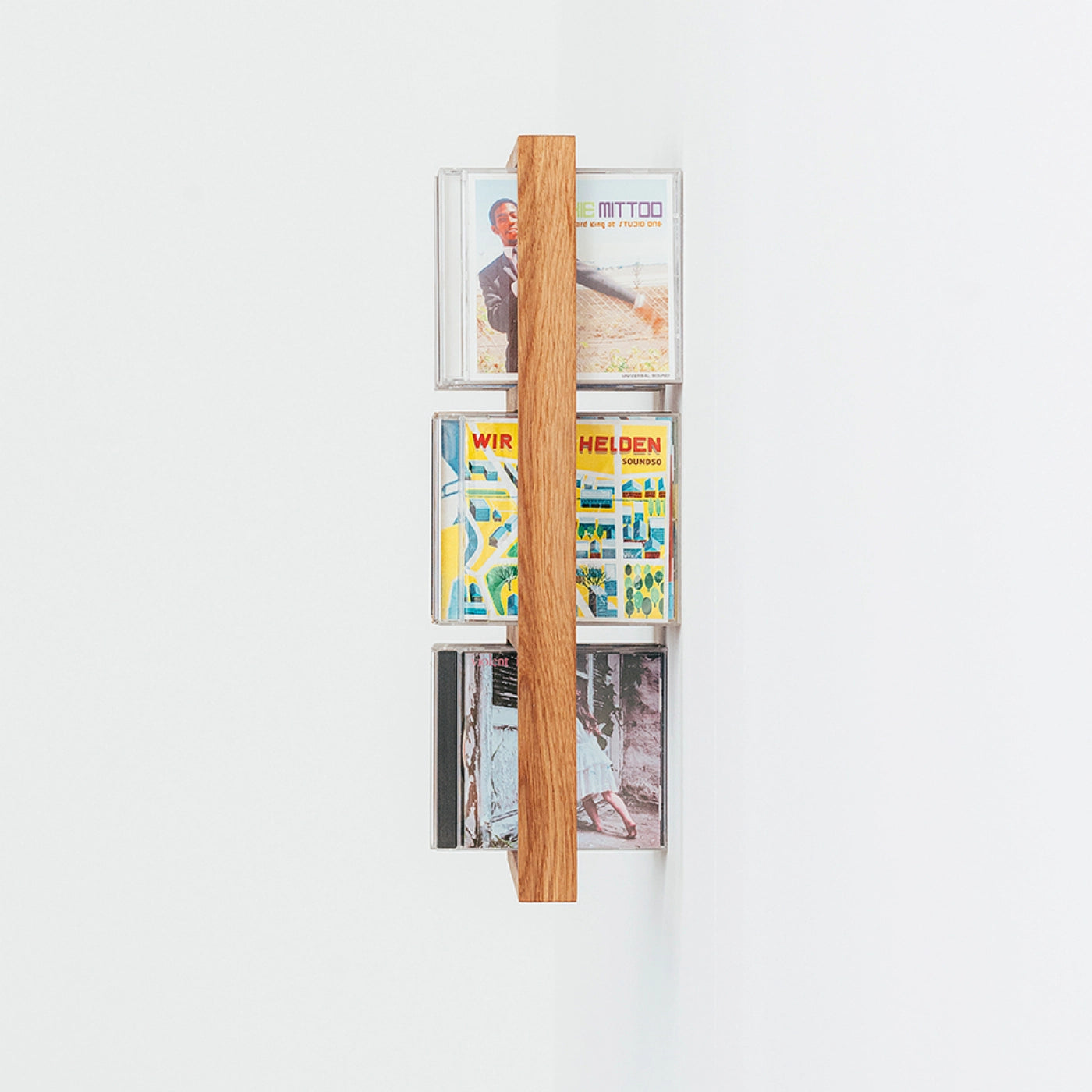 Her svæver cd'erne over og under hinanden. Tre rækker cd'er holdes kun af to små rustfri stålbeslag, der forsvinder mellem hylstrene og bliver bogstaveligt talt usynlige. Kun uden cd'er kan du se den struktur, der holder reolen til væggen. Det specielle: Du kan fylde denne reol helt med omkring 80 cd'er - eller bevidst efterlade huller, der understreger den lette og svævende kvalitet.