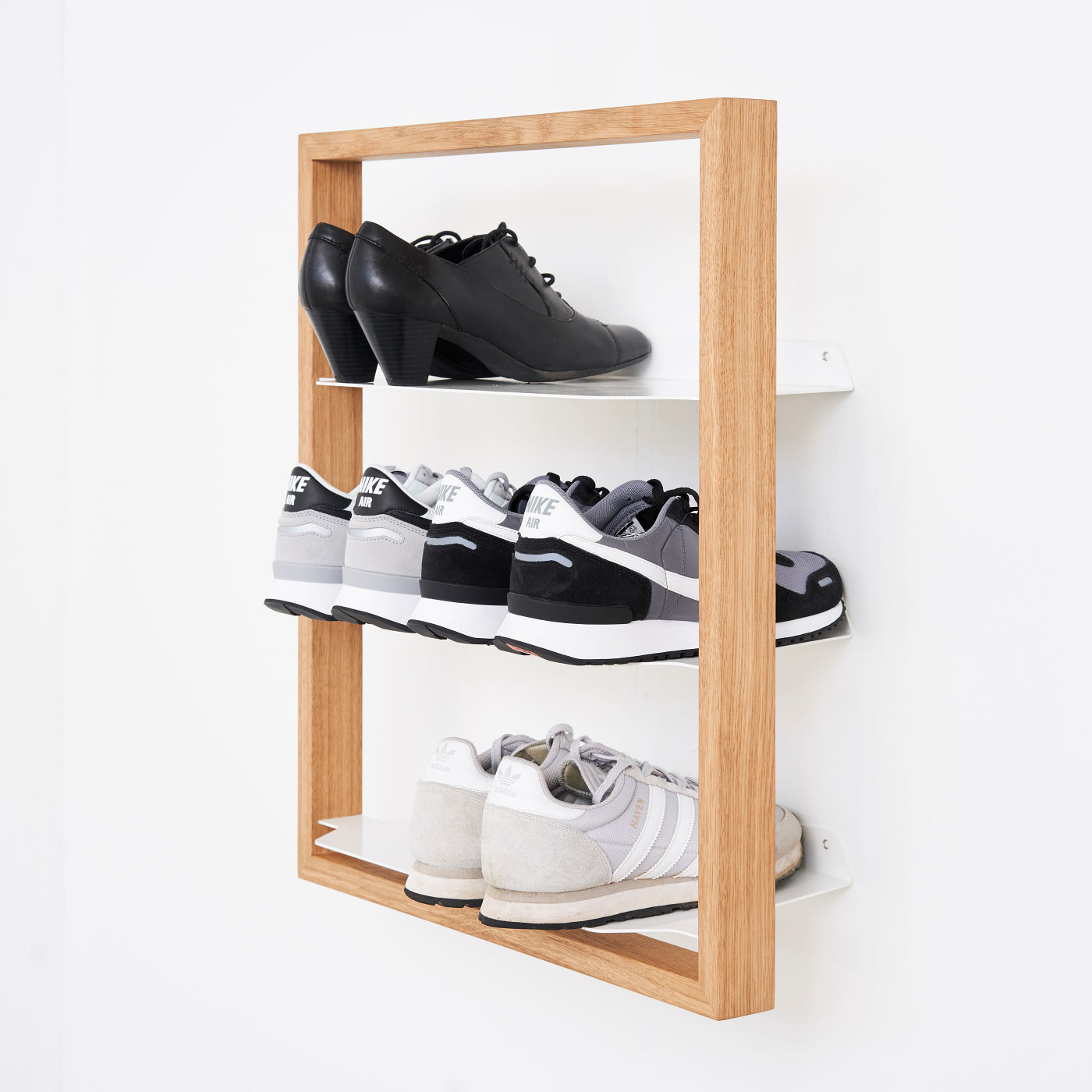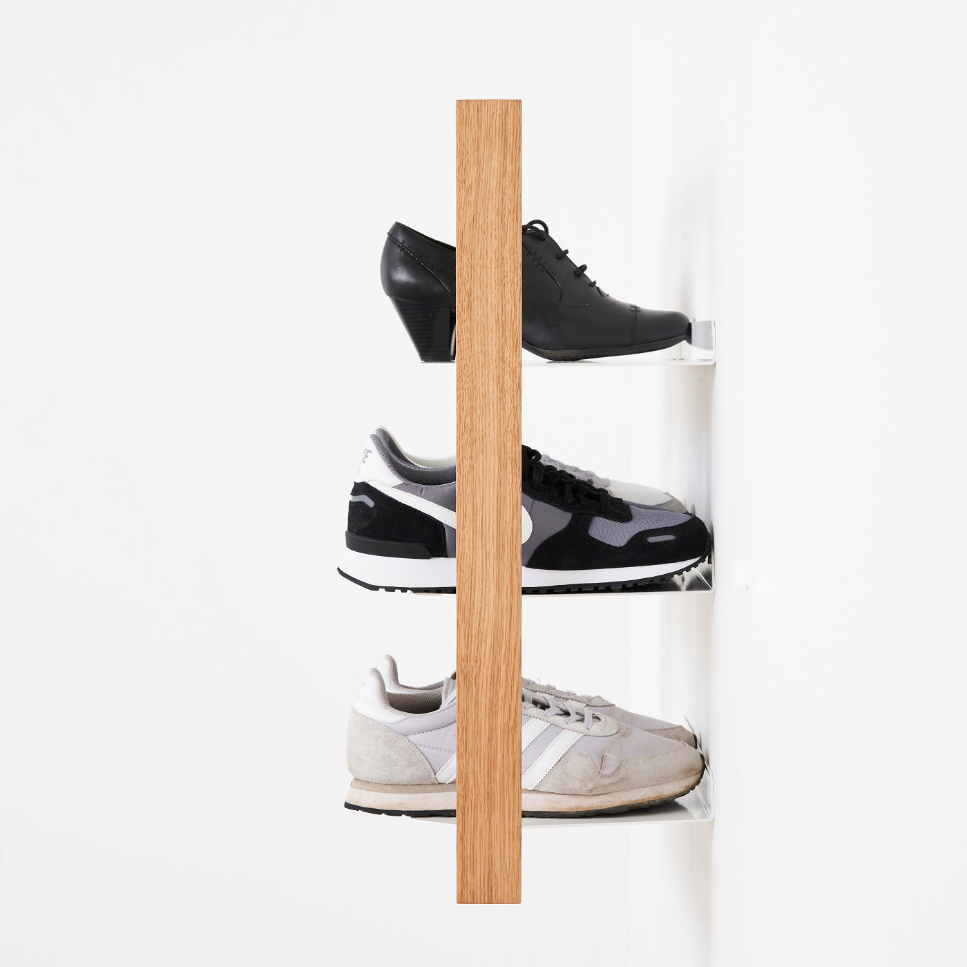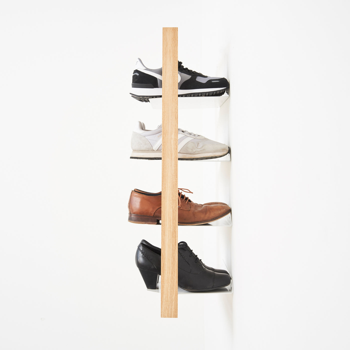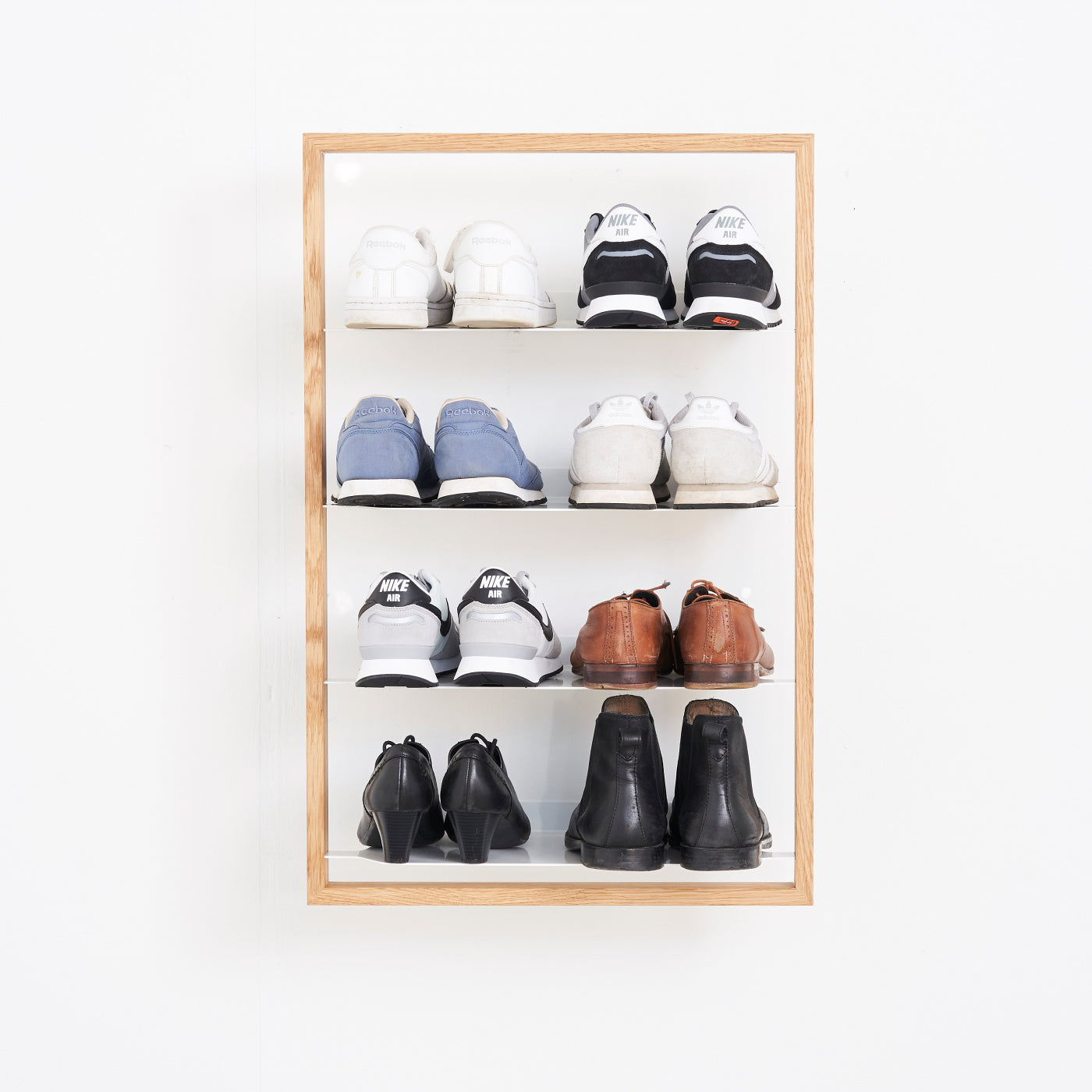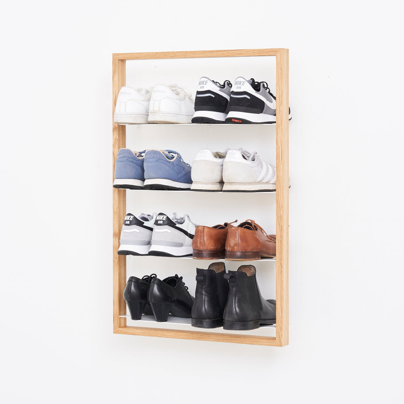 Kunne der være et mere funktionelt møbel end et skoreol? Faktisk ikke, for skoreolen eksisterer faktisk kun for at få sko til at forsvinde så upåfaldende som muligt. Men mange mennesker sætter stor pris på deres fodtøj og ejer mange par af dem. Derfor er det godt for gangen, hvis skoene forsvinder på æstetisk vis. I denne ånd er skoreolen basti en let rammekonstruktion lavet af olieret eg, med hvide pulverlakerede stålhylder. Upåfaldende og alligevel meget smuk.