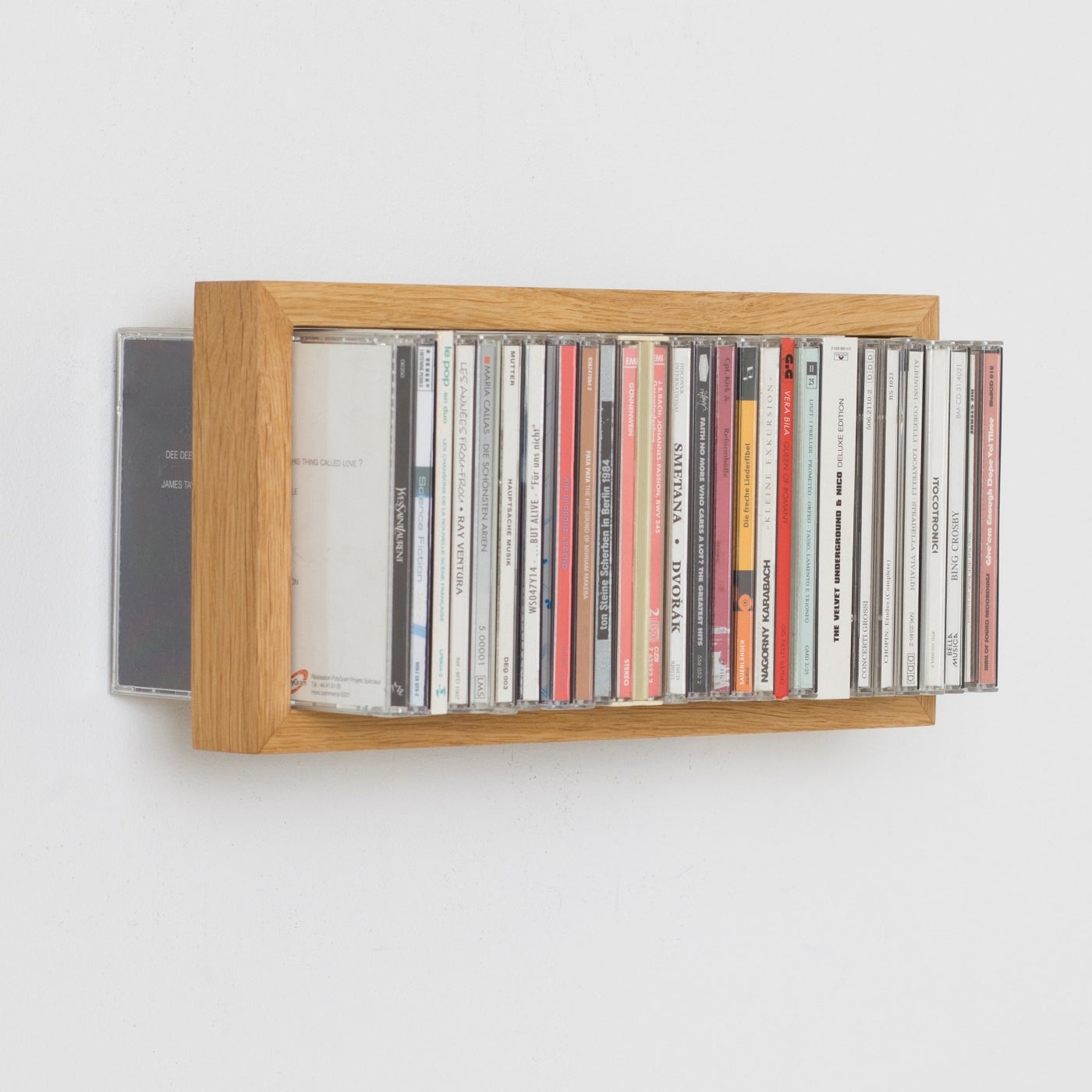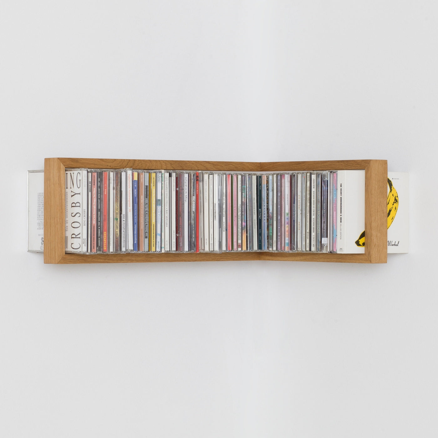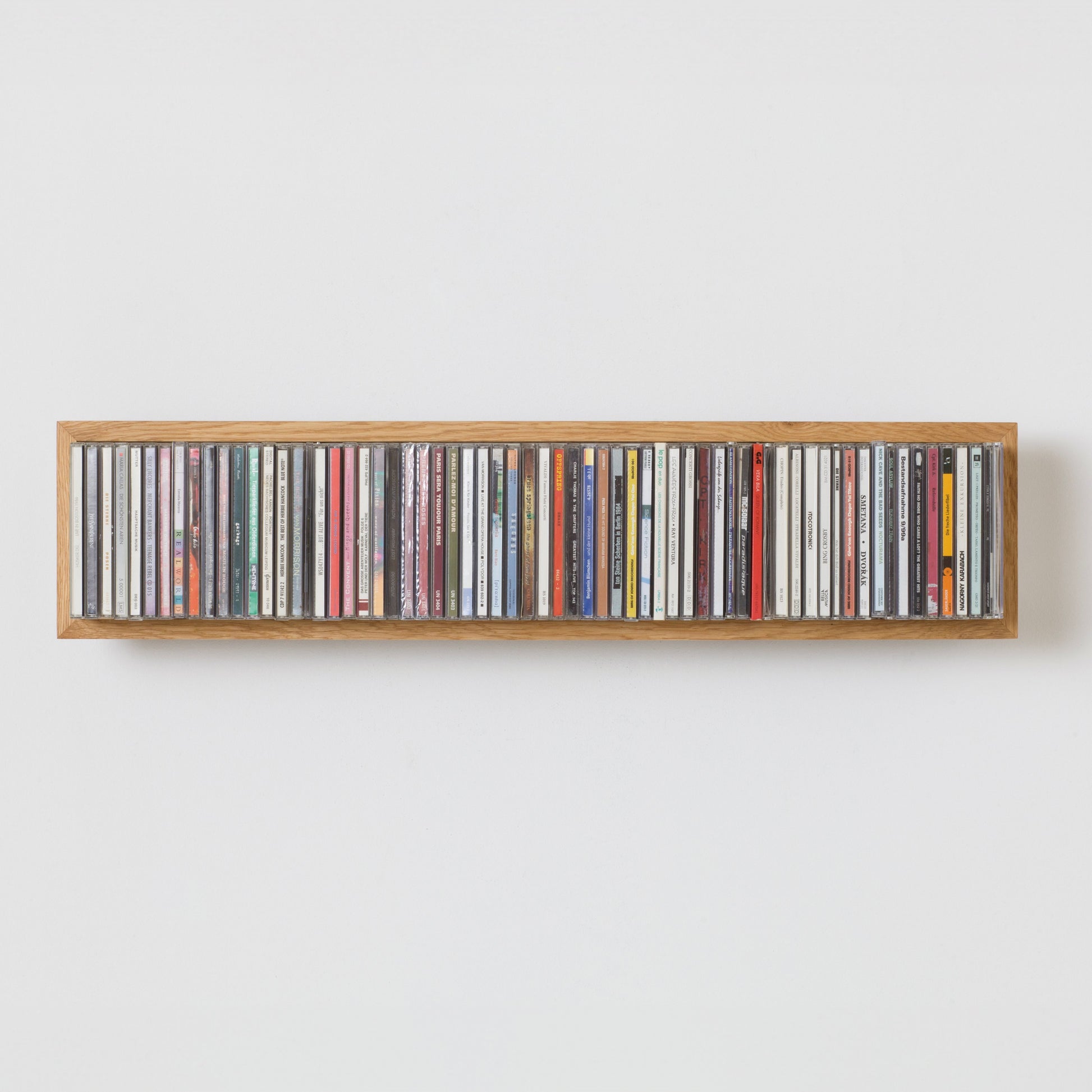 Floating CDs? Absolutely! The shelf for CDs is now also available in three sizes to match shelf b. Recessed stainless steel brackets hold the shelf to the wall, but you can only see this when it is completely empty.