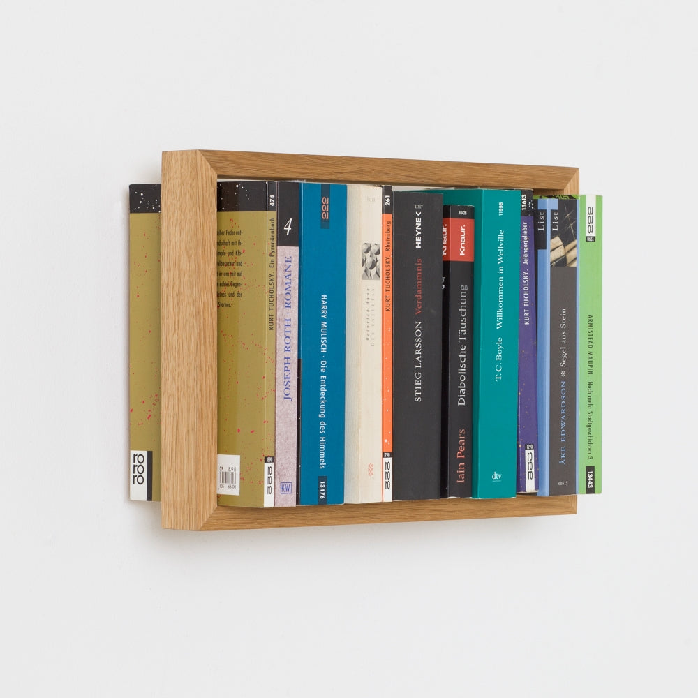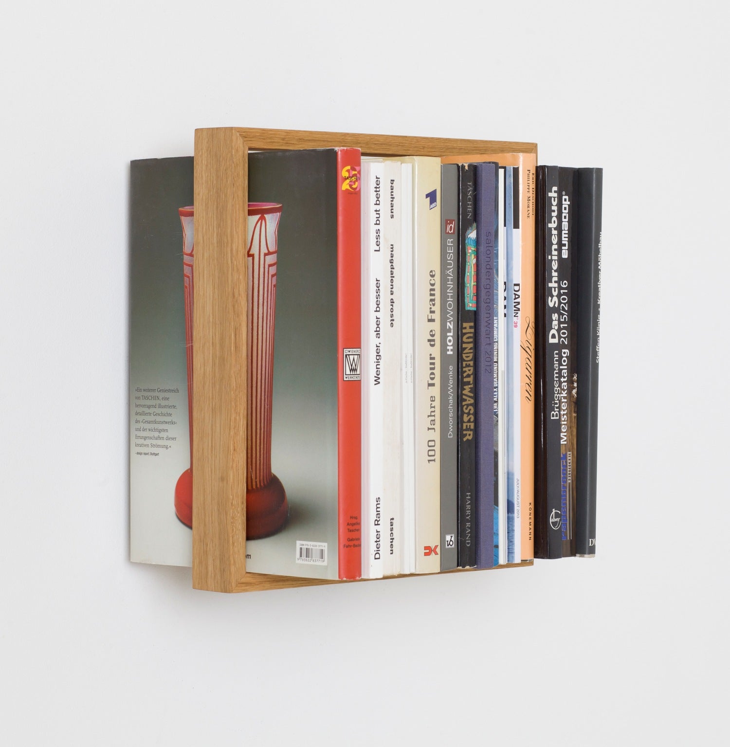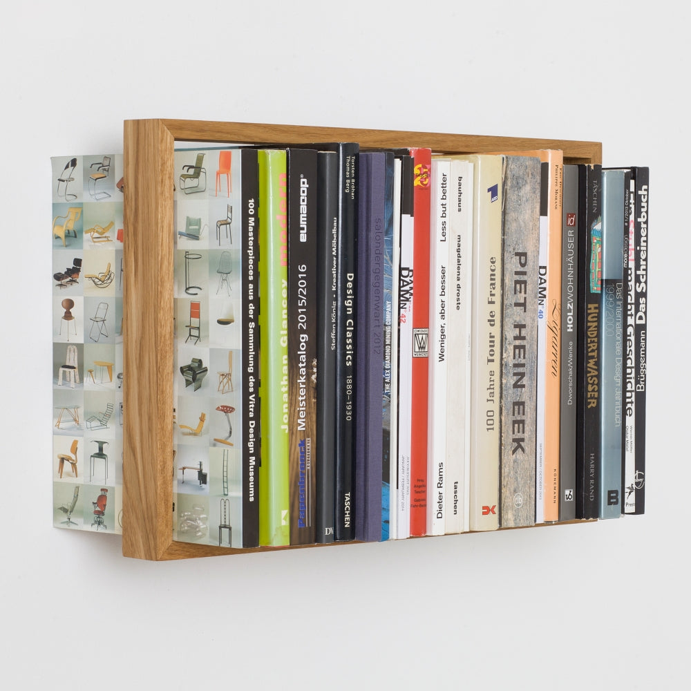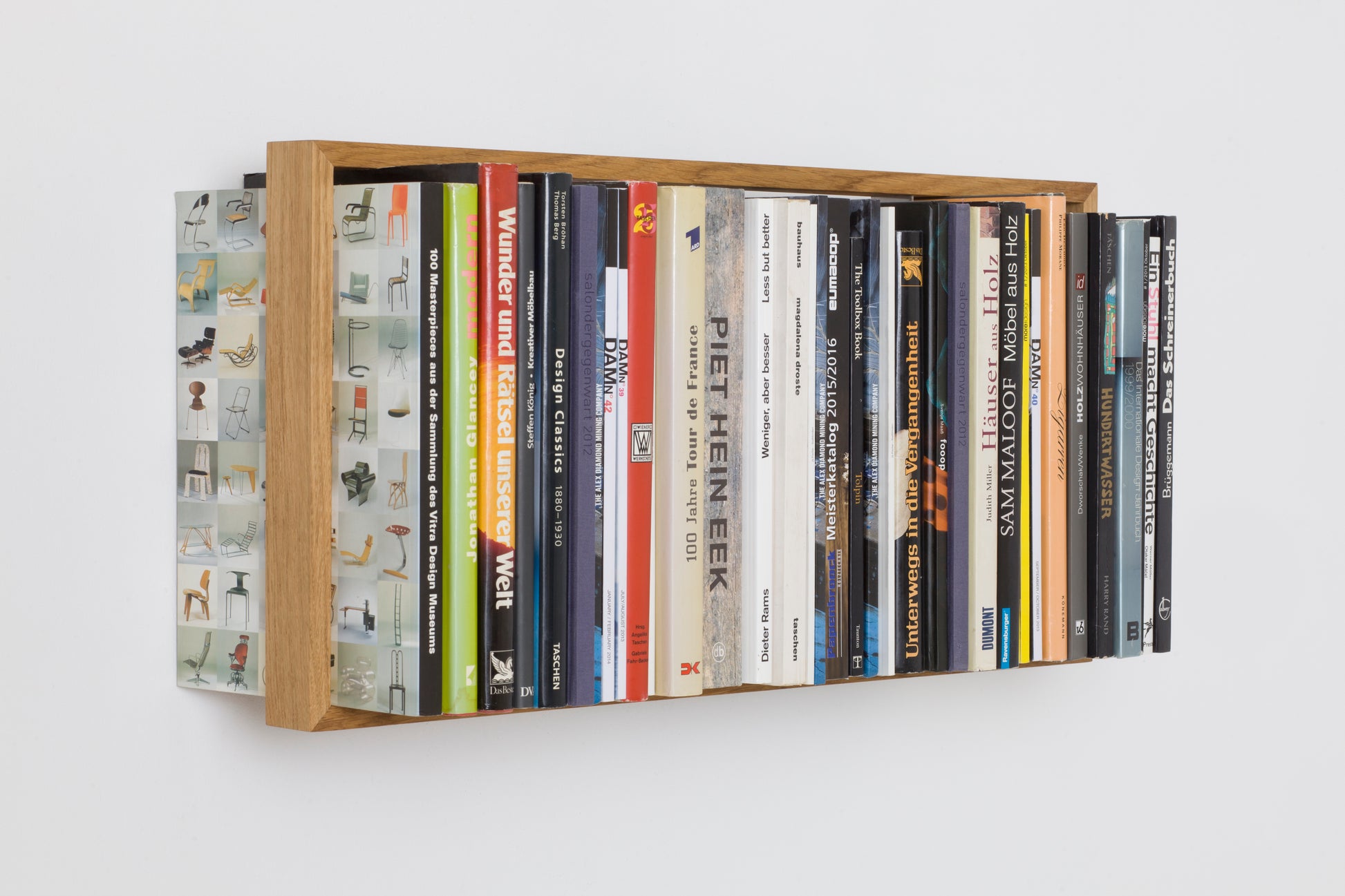 Schwebende Bücher – diesen Eindruck gewinnt man beim Regal b. Ob Kunstband oder Taschenbuch – einzig der massive Holzrahmen scheint den Büchern Halt zu geben. Ohne Bücher lüftet sich das Geheimnis, eingelassene Edelstahlwinkel halten die Konstruktion an der Wand.