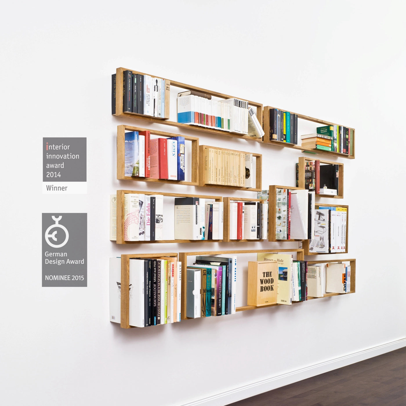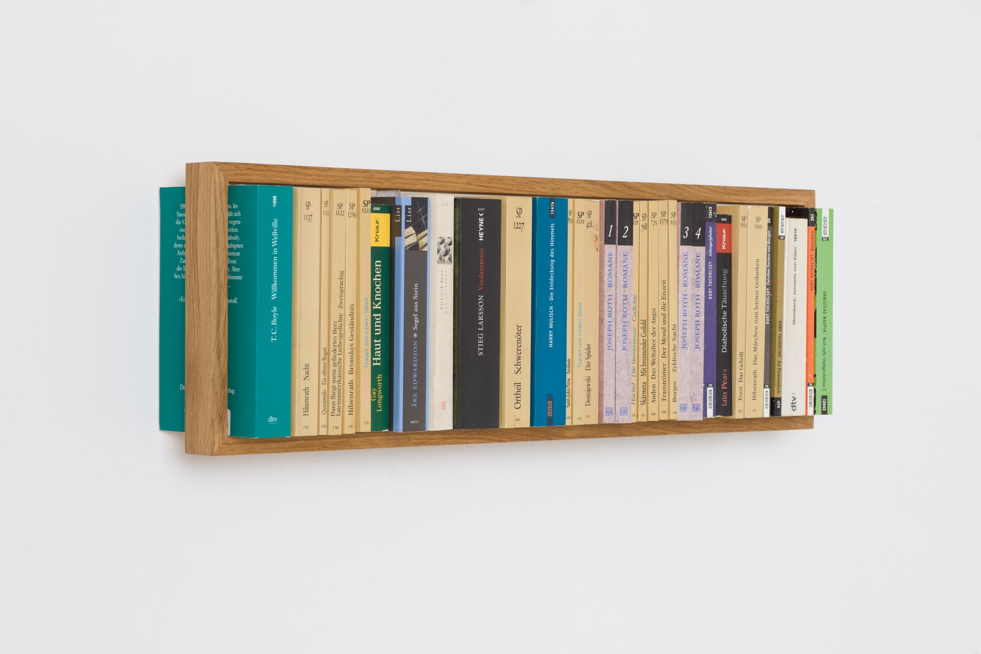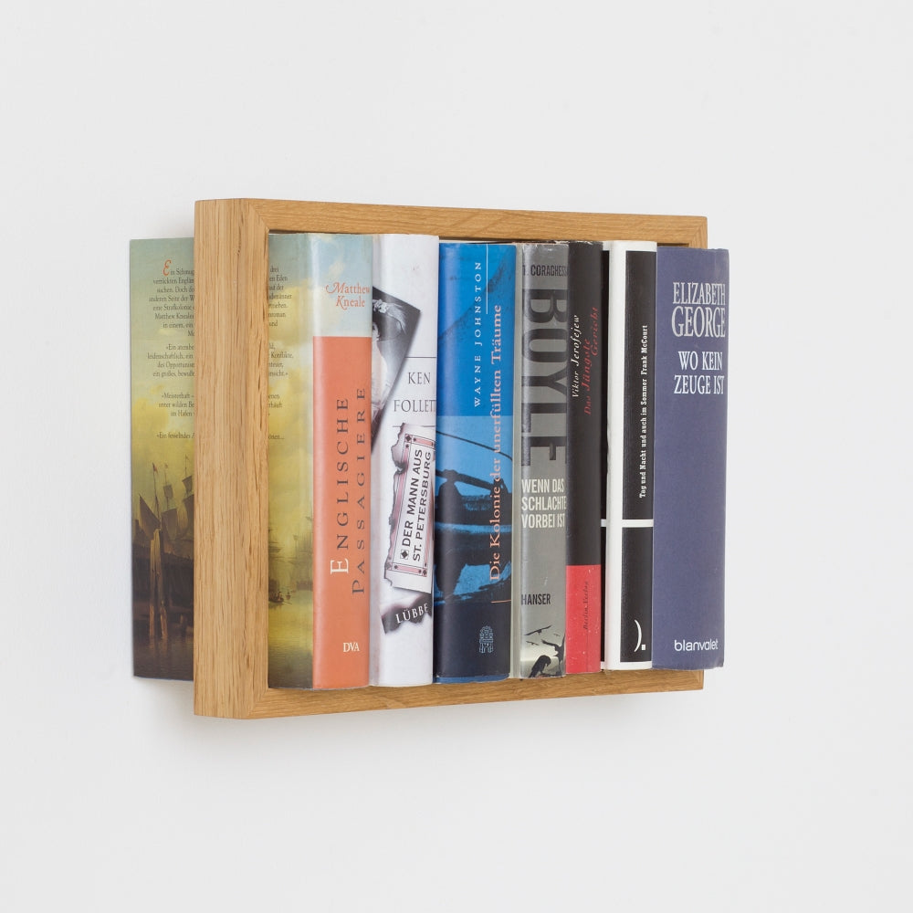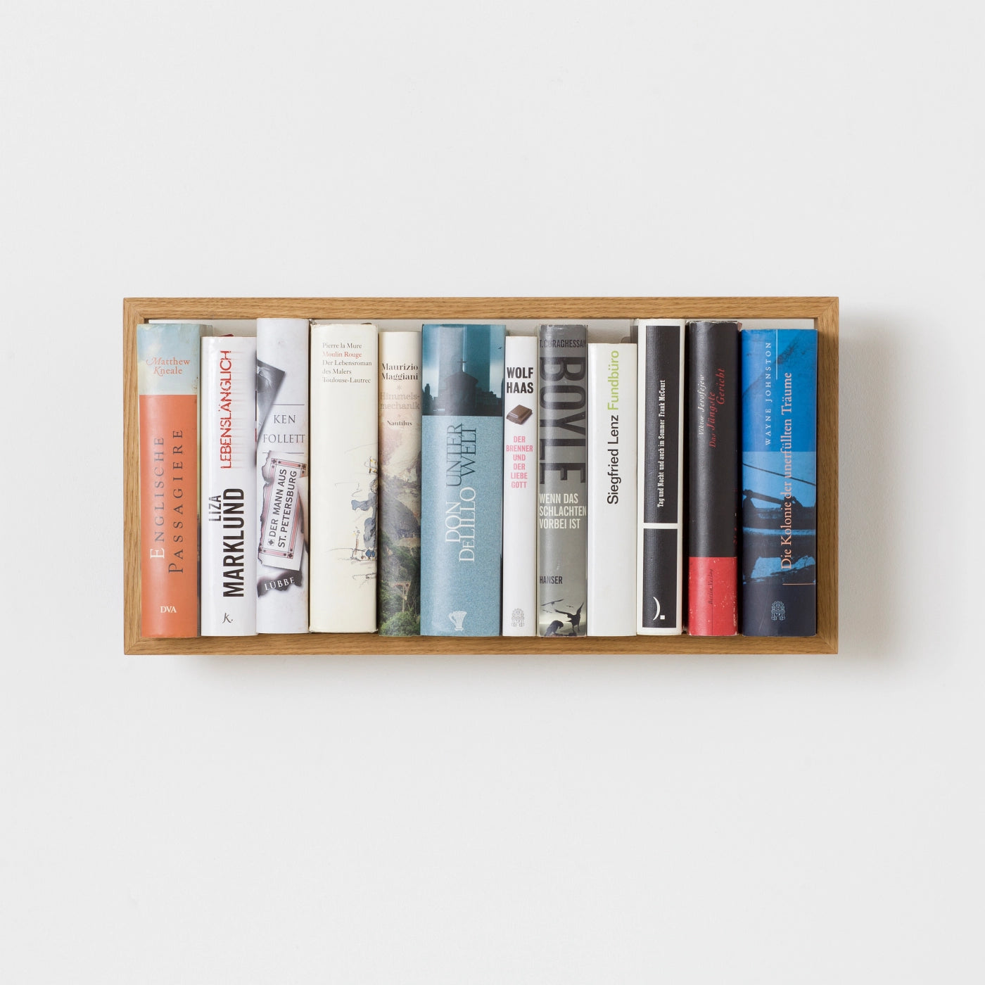 Schwebende Bücher – diesen Eindruck gewinnt man beim Regal b. Ob Kunstband oder Taschenbuch – einzig der massive Holzrahmen scheint den Büchern Halt zu geben. Ohne Bücher lüftet sich das Geheimnis, eingelassene Edelstahlwinkel halten die Konstruktion an der Wand.