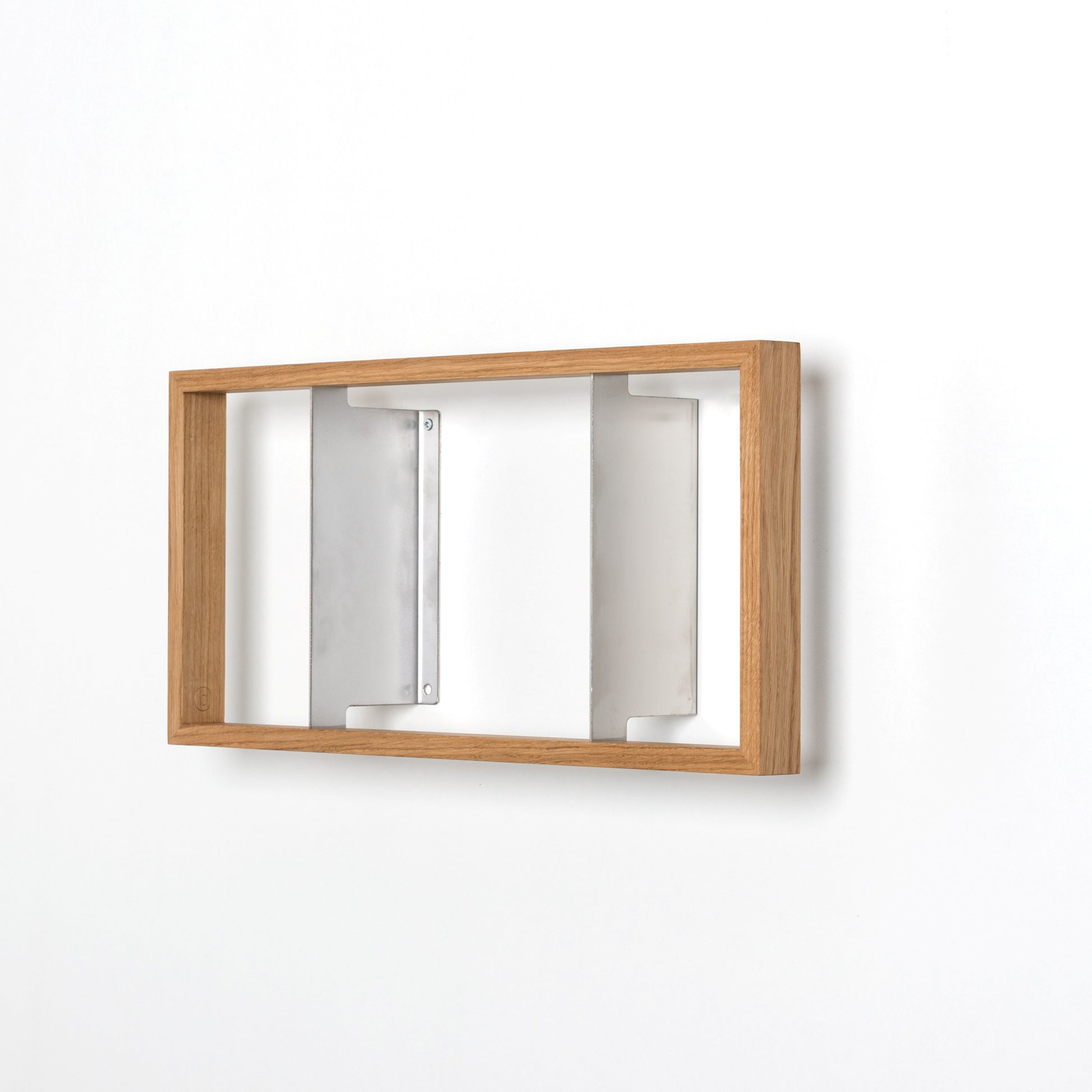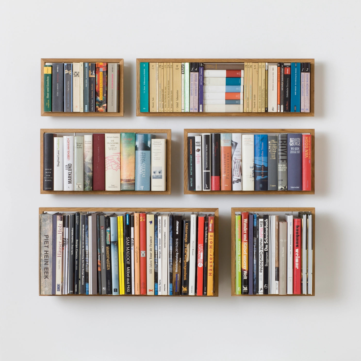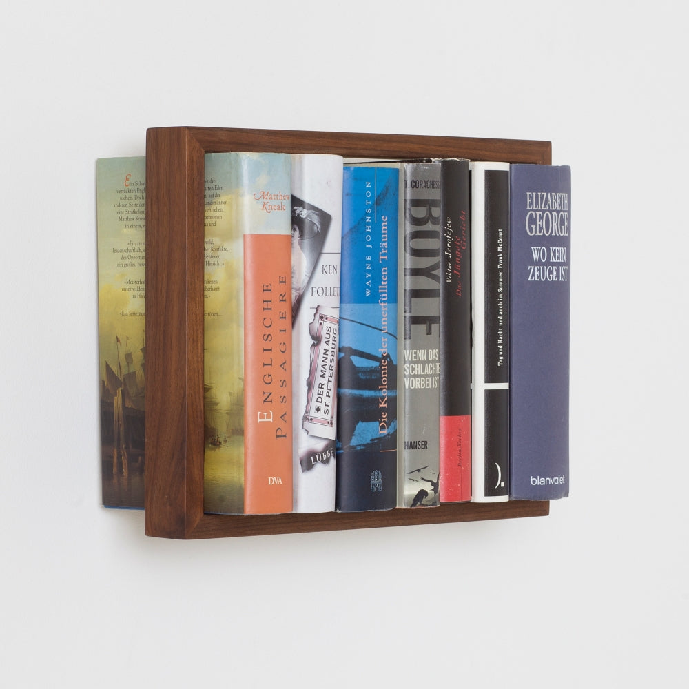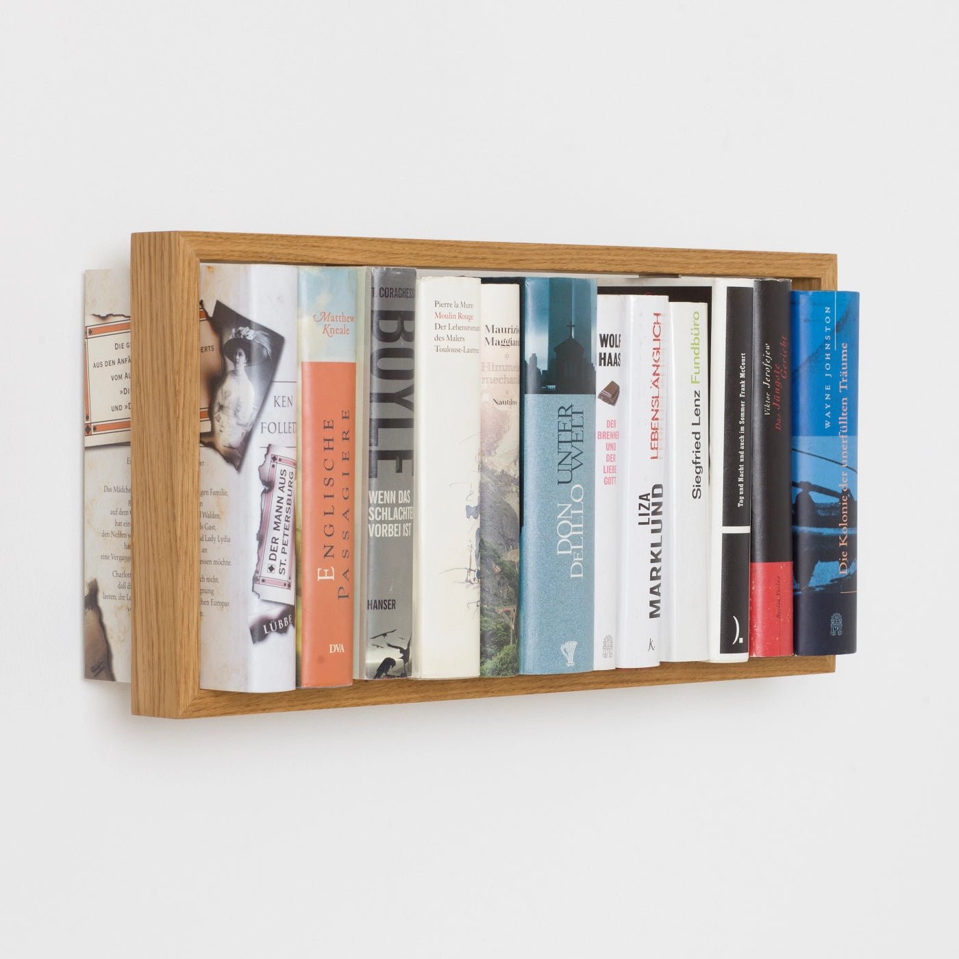 Schwebende Bücher – diesen Eindruck gewinnt man beim Regal b. Ob Kunstband oder Taschenbuch – einzig der massive Holzrahmen scheint den Büchern Halt zu geben. Ohne Bücher lüftet sich das Geheimnis, eingelassene Edelstahlwinkel halten die Konstruktion an der Wand.